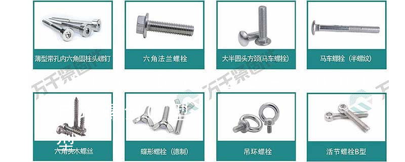 螺栓有:1、方頭螺栓,2、半圓頭方頸螺栓,3、十字槽盤頭螺釘,4、內六角沉頭螺釘,5、方螺母C級,6、蝶形螺母,7、六角頭螺栓,8、十字槽盤頭自攻螺釘。大小有M18、M6、M8、M16、M10、M12、M14、M20等型號。通常用