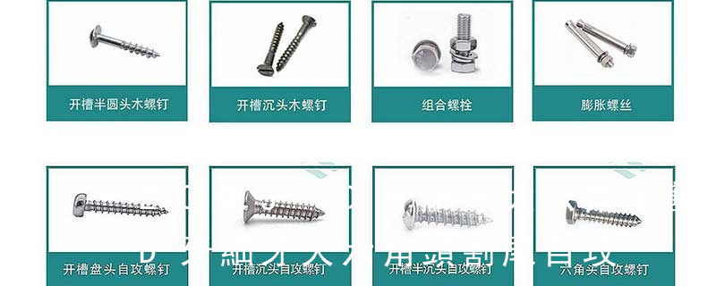1、Flat:平頭 (鎖入后,頂部與工作件齊平)2、Oval:色拉頭、O頭、半沉頭 3、Round:圓頭 4、Pan:圓扁頭 5、Truss:大圓扁頭 6、Hex:六角頭 A-5:Finish Code/外觀處理。公制自攻螺絲 :于品名后方直接標示 Tapp 主要分類包括普通螺絲、機螺絲、自攻螺絲和膨脹螺絲三種。 有頭螺釘Cap screw 過去限于全牙的扣件。 六角頭螺釘Hex cap screw與大六角螺栓Hex bolt 顧名思義為頭部為六角型的外螺紋扣件,設計為使用扳手轉動。依照ASME B18.2.1標準,六