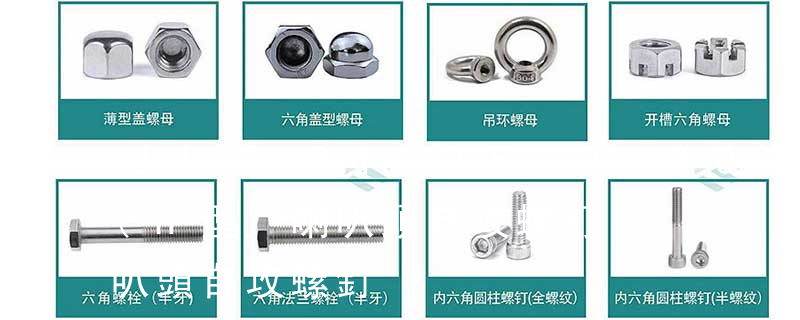 螺栓有:1、方頭螺栓,2、半圓頭方頸螺栓,3、十字槽盤頭螺釘,4、內六角沉頭螺釘,5、方螺母C級,6、蝶形螺母,7、六角頭螺栓,8、十字槽盤頭自攻螺釘。大小有M18、M6、M8、M16、M10、M12、M14、M20等型號。通常用